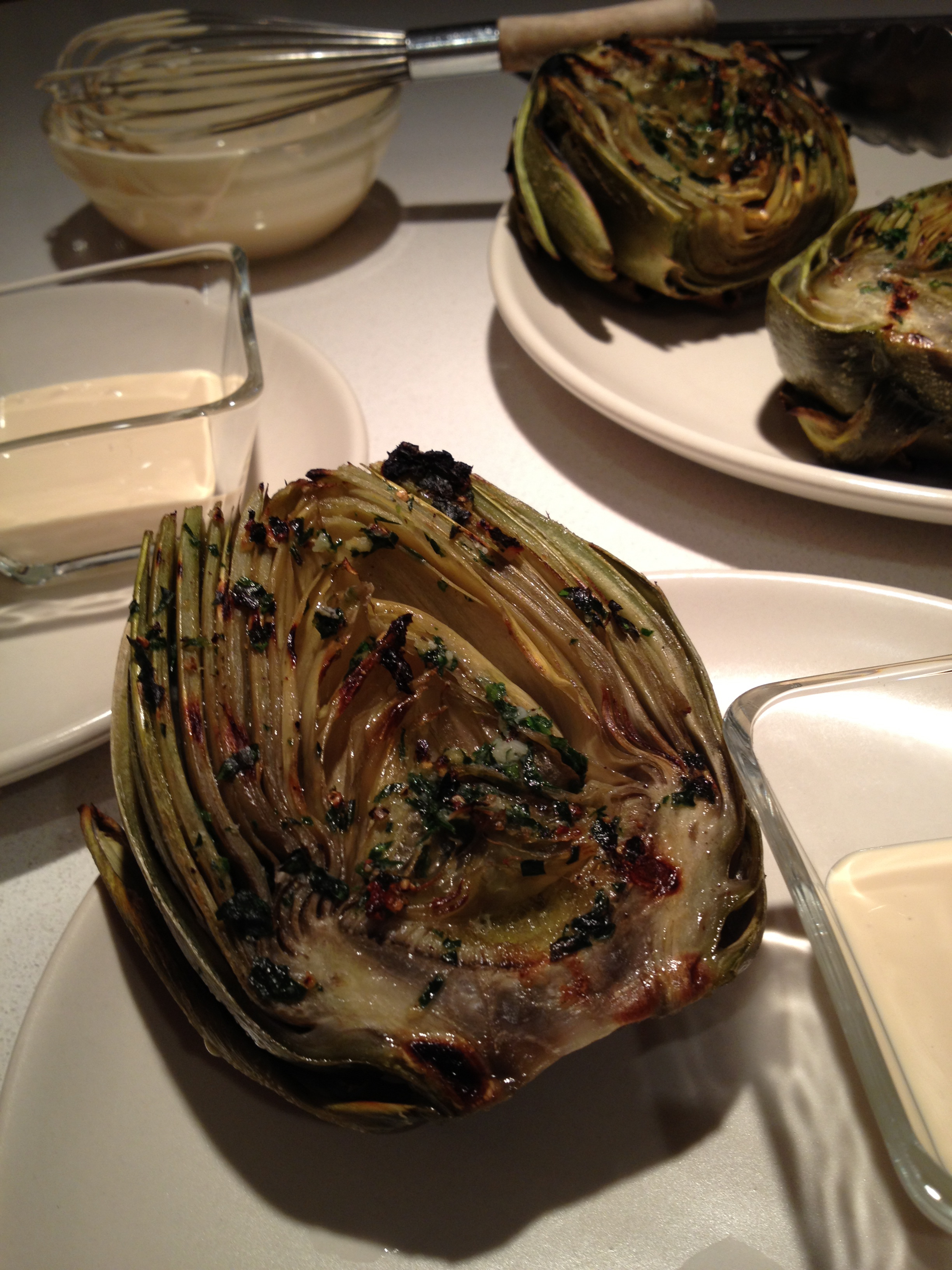 IMG_1305 Published February 4, 2013 at 2448 × 3264 in Grilled Artichokes with Creamy Sesame Sauce ← Previous Next → Plating with individual servings of sauce.