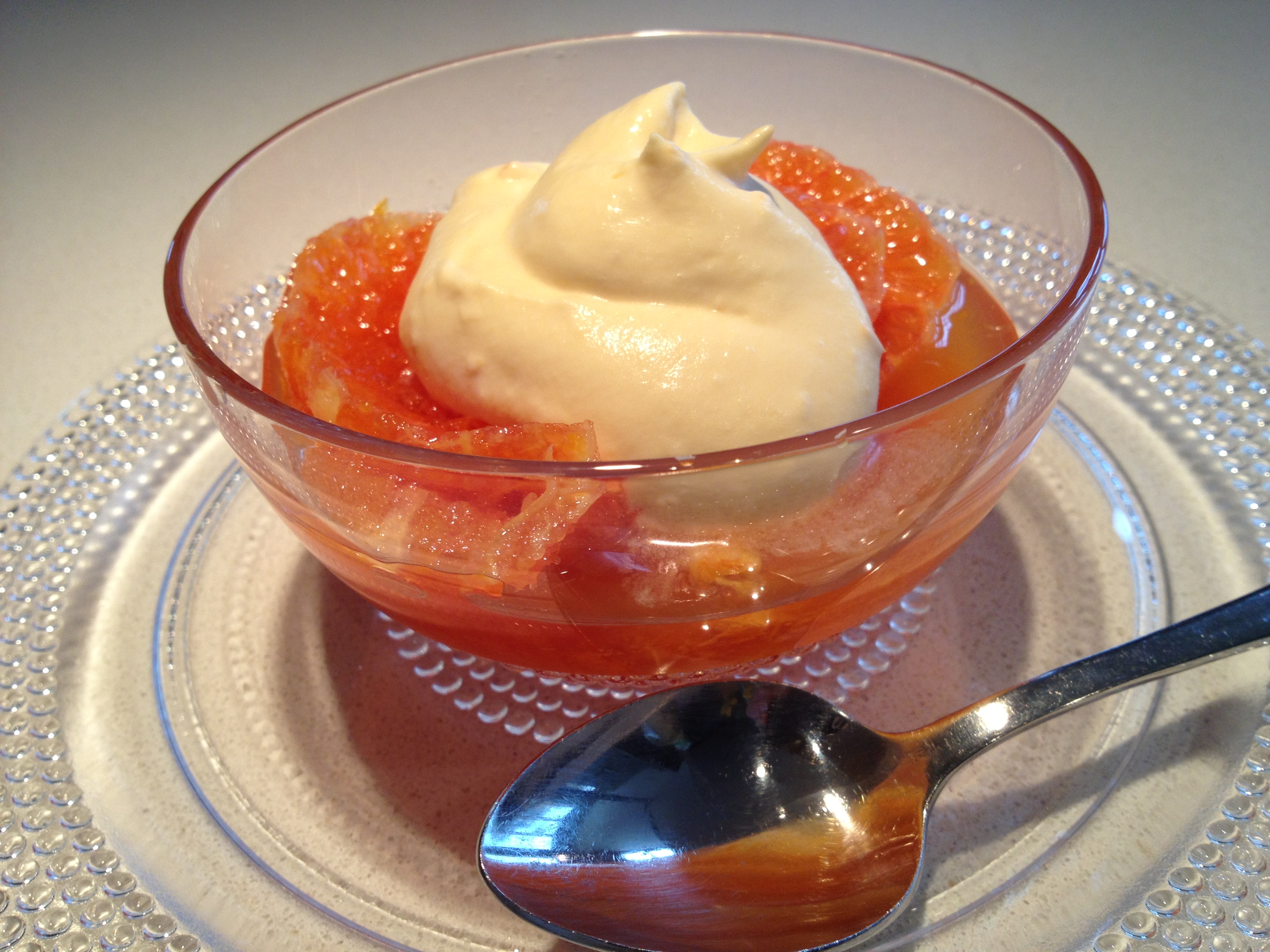 When I offer to bring dessert to a Book Group meeting, Whitney almost always requests Oranges with Grand Marnier Zabaione. (And she’s a connoisseur of chocolate!) It’s a perfect dessert for any time of year, but especially welcome now because of the citrus fruit coming into season in Florida and California. I was inspired to make this because a friend served whole, unpeeled Cara Oranges for dessert at a lunch meeting last week. Peeling and eating the delicious fresh fruit reminded me of a scene in Cranford, a BBC mini-series starring Judy Dench. In it one of the characters leaves the dining table to eat an orange in the privacy of her bedroom because she felt using her fingers to peel, section, and enjoy the exotic fruit, was too intimate an act to perform in public.