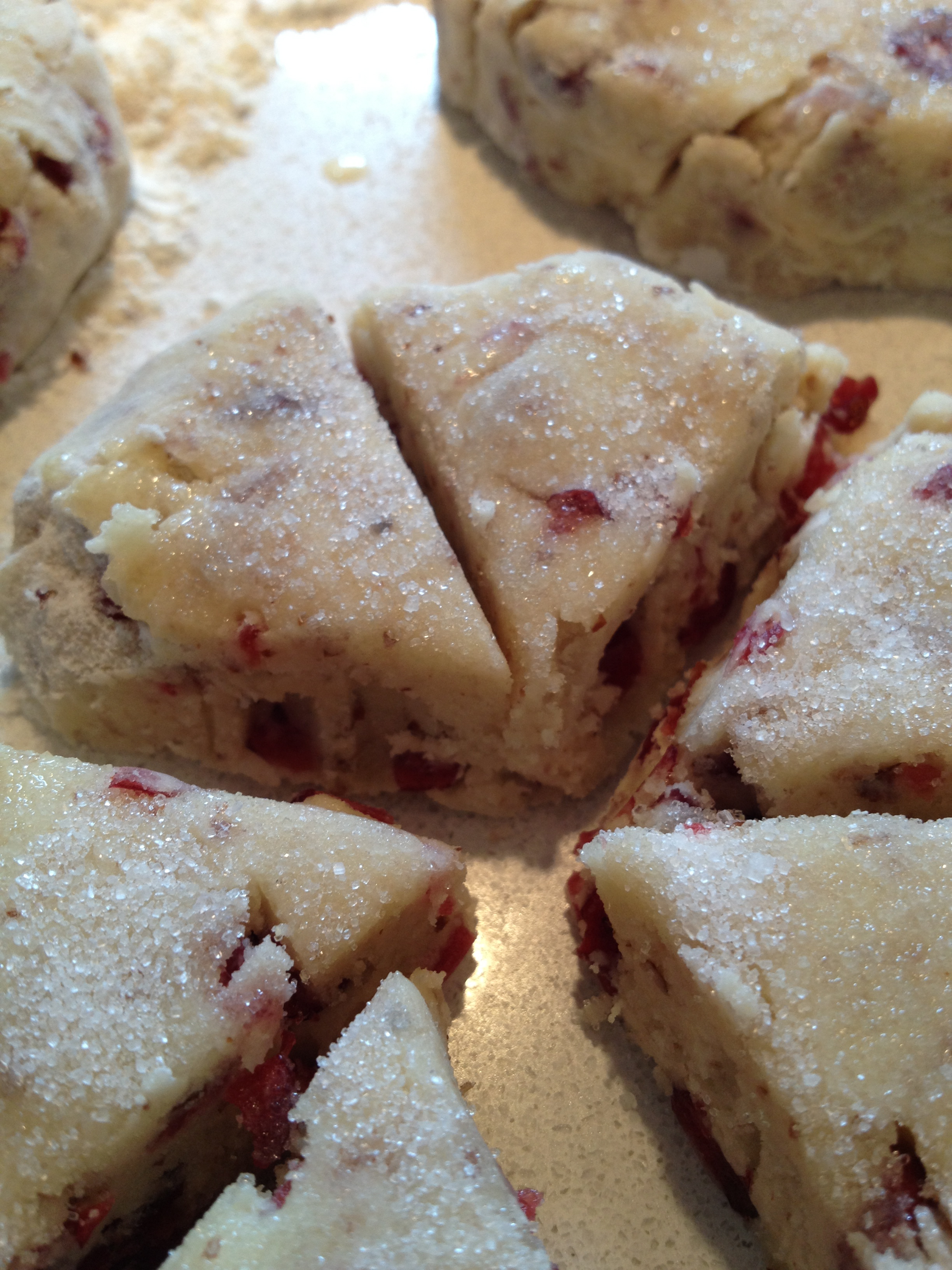 IMG_4102 Published June 30, 2013 at 2448 × 3264 in Cranberry Scones with Lemon Curd ← Previous Next → Disks cut into sixths – sprinkled with maple sugar