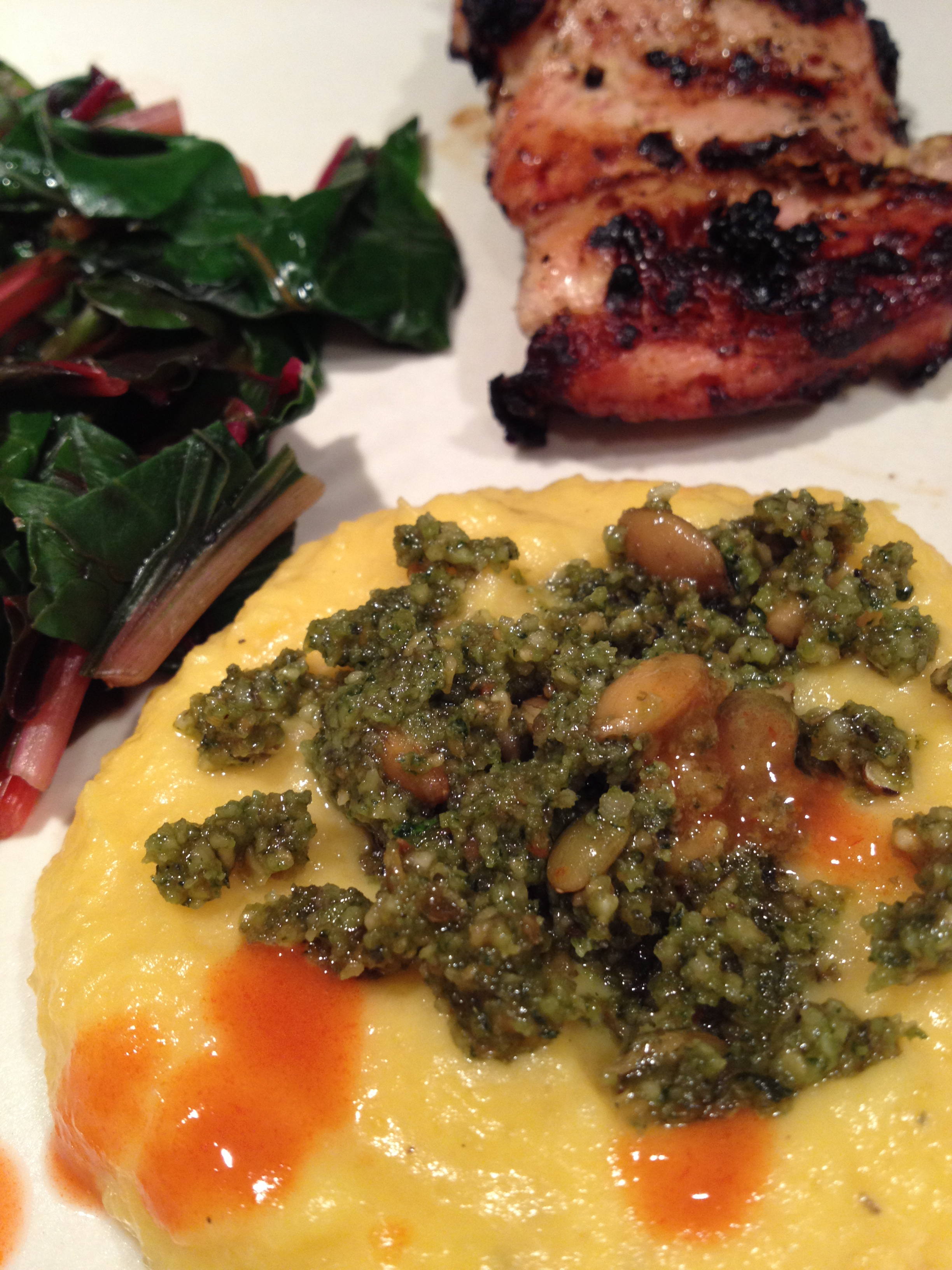 IMG_5820 Published September 30, 2013 at 2448 × 3264 in Creamy Pumpkin Puree ← Previous Next → Topped with Pumpkin Seed Pesto served with grilled chicken and steamed chard